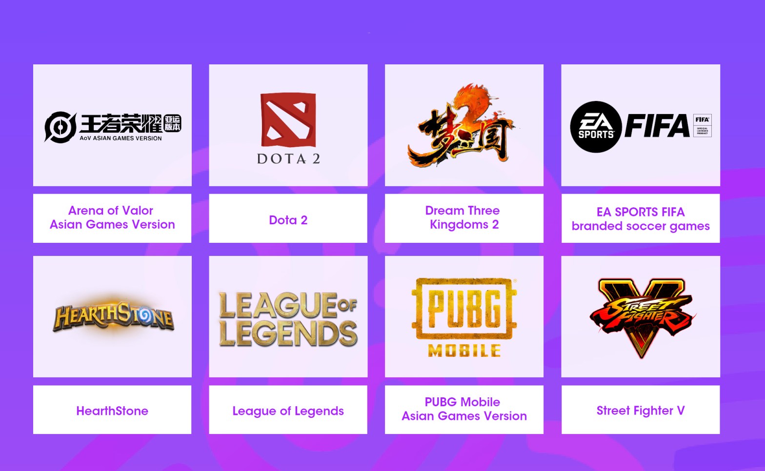 The Games include: 1) Arena of Valor, 2) DOTA 2, 3) Dream Three Kingdoms, 4) EA Sports FIFA, 5) Hearthstone, 6) League of Legends, 7) PUBG mobile, and 8) Street Fighter V.